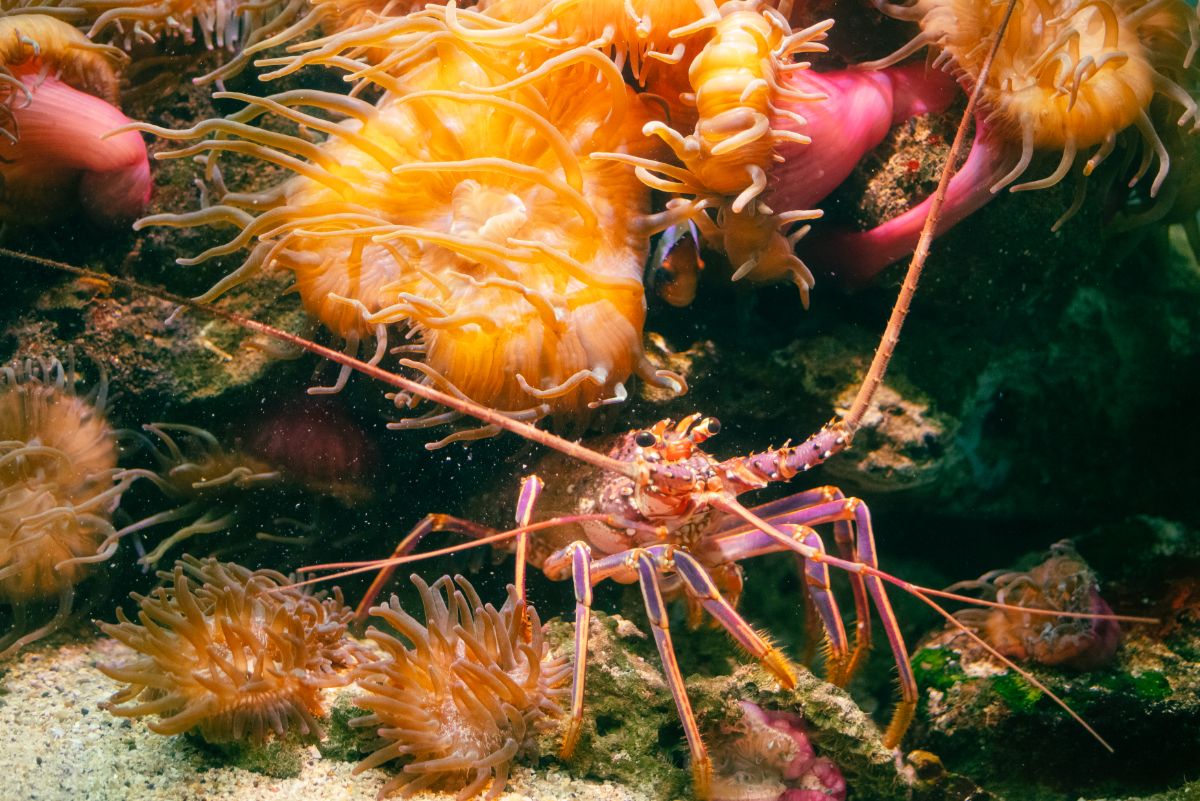 1階の奥にある階段から、タカアシガニなどの深海生物やウニを展示する「ふれあい水槽」がある2階へと進みましょう。飼育員さんによる手作りの解説パネルを読み進めながら、一番奥のスペースへ。