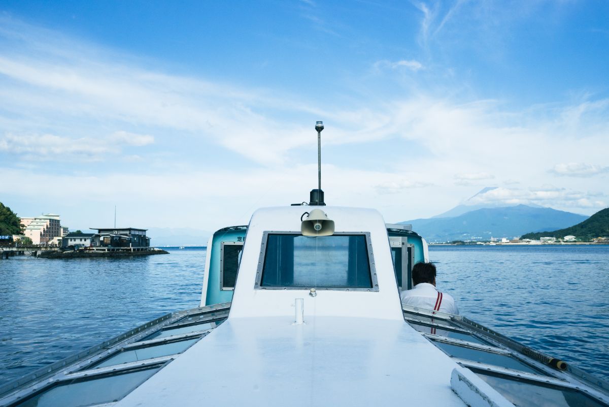 船内の席のほか、さわやかな潮風と海辺の風景を楽しめるデッキの席もあるので、好きな場所を選びましょう。晴れた日には、船上から富士山を見ることができます。