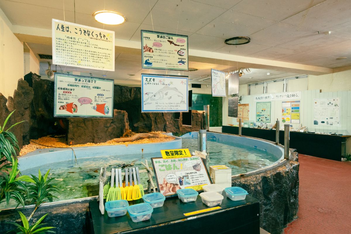 館内に入ってすぐの水槽では、ネコザメ、エイ、ハタ、カンパチ、スズキなどの大きな魚へのエサやり体験をすることができます。テーブルの上の保存容器には、新鮮なアジの切り身が4切も!