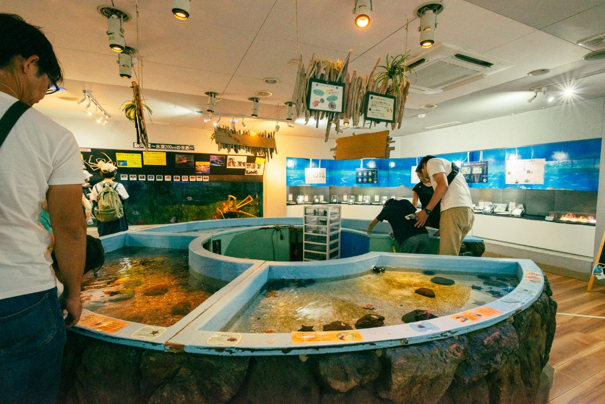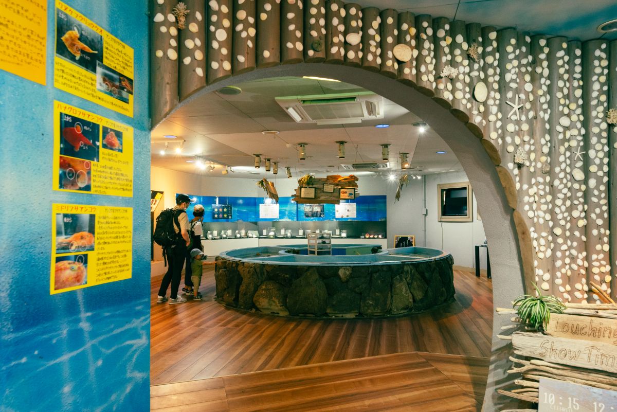 部屋の中心にある「ふれあい水槽」では、ヒトデやウニ、ナマコなどに触ることができます。平日は1日2回、土・日曜と祝日は1日3~4回(時期により異なる)、飼育員さんによる「お魚解説」も実施されていますよ。