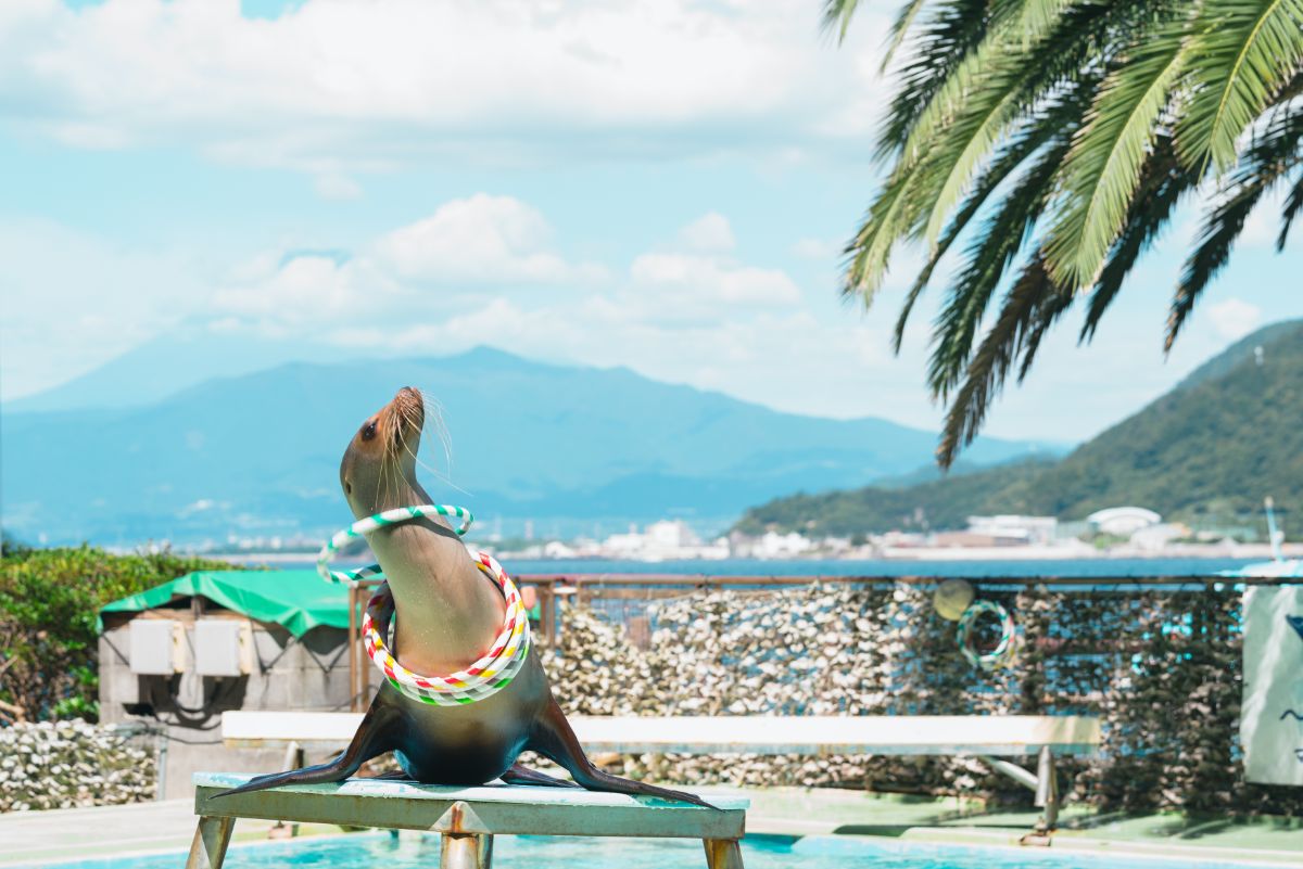 海のすぐそばにあるプールでは、大きな富士山を背景に、アザラシとアシカによるショーが行われます。登場するアシカやゴマフアザラシのキャラクターも詳しく解説してくれるので、海獣たちとの距離がグッと縮まります。