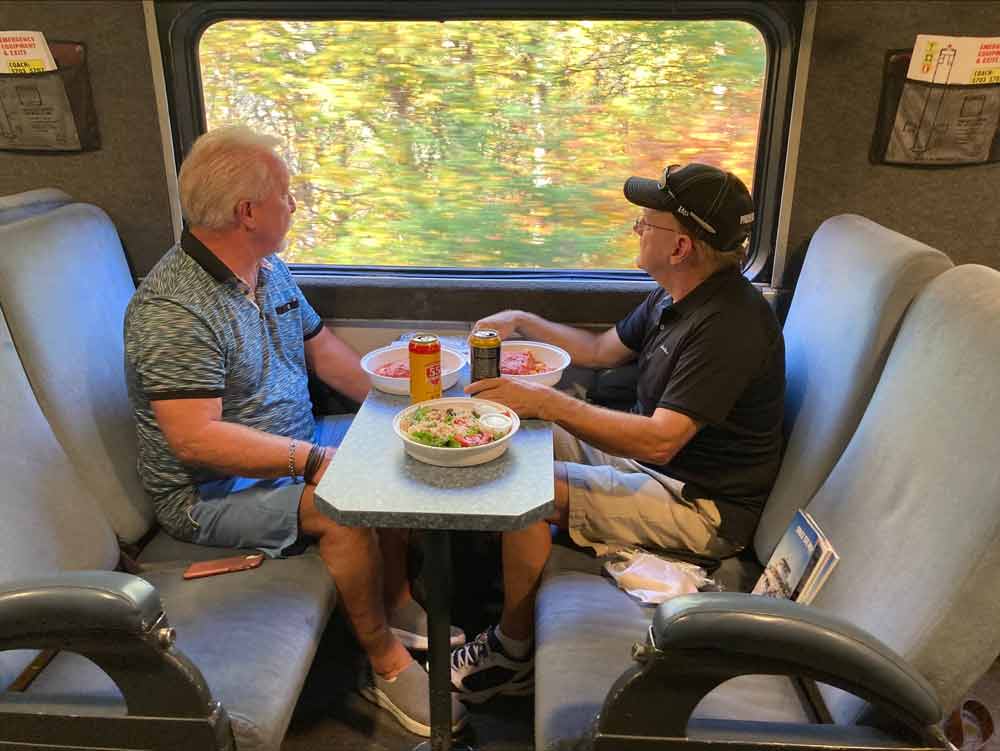 復路にて遅めのランチに。今回取材ではスナック・カーに乗車、朝食も利用できますが、ランチメニューは「ミートボールのペンネ」、「チキンラップサンド」、「ロティスリーチキンサラダ」など5種から選べました(食事は予約がベターです)。