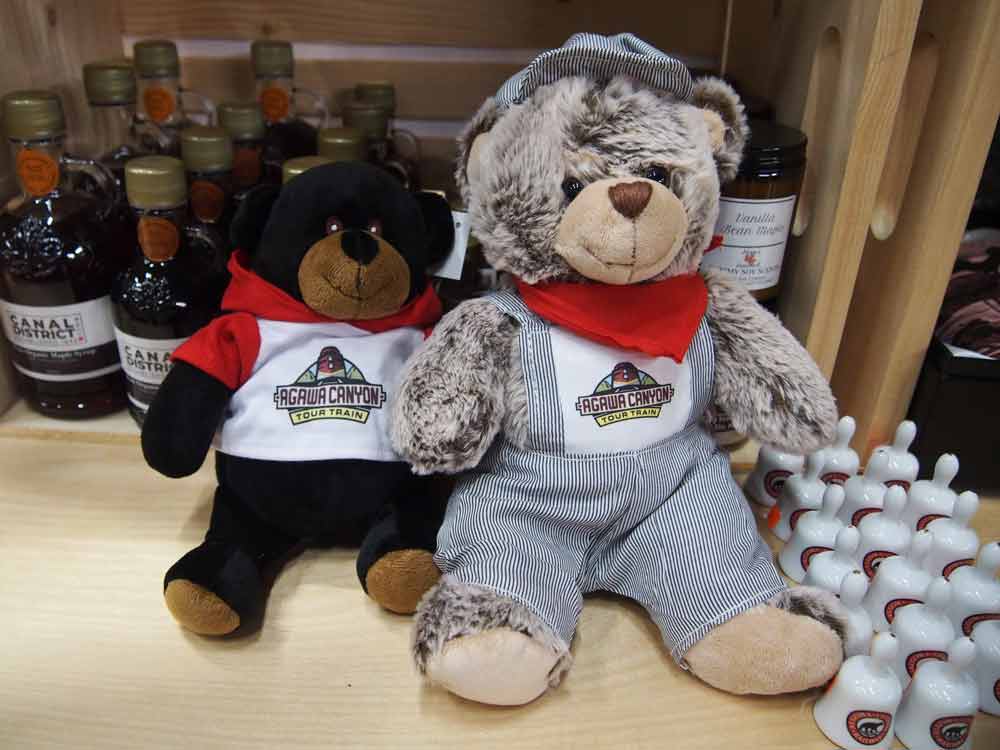 発着駅のショップでは、「ぬいぐるみ」$25(右)などのアガワ鉄道グッズが買えます。