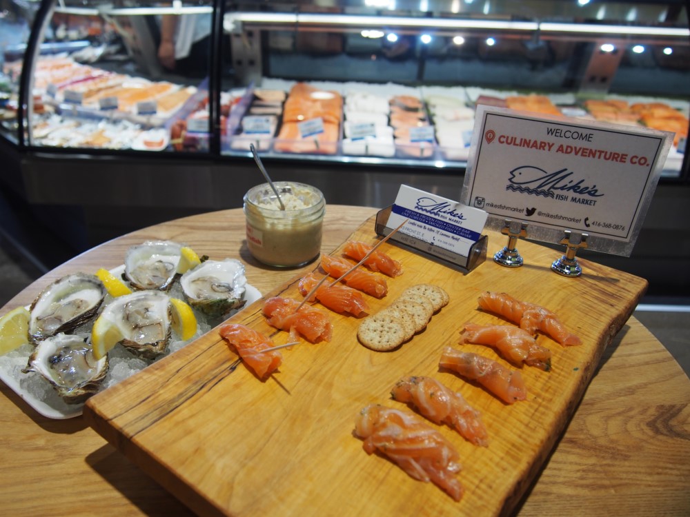 鮮魚店のマイクズフィッシュマーケットでは、サーモンとカキを試食させていただきました。その時々でおいしい素材をカナダ各地から仕入れているそうです。