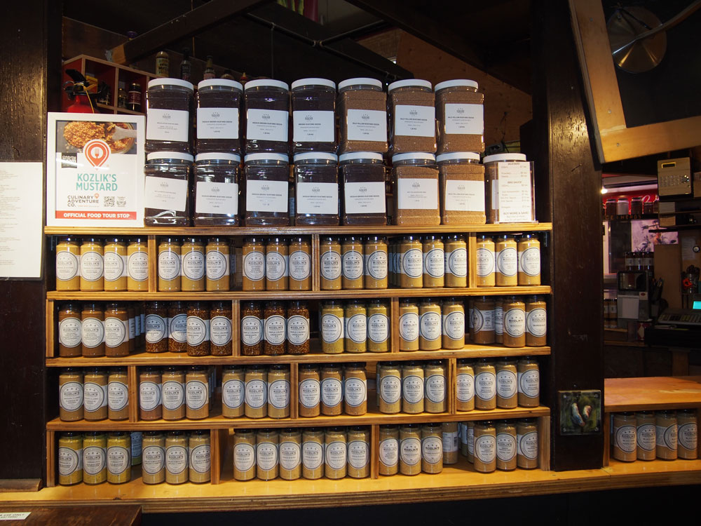 いろいろな種類のマスタードがずらりと並ぶ、ANTON KOZLIK'S(アントン・コズリクス)のマスタード店。カナダならではの、メープルが入ったマスタードのほか、ガイドのケビンさんのおすすめは、バルサミコ酢の入ったものだとか。1本 $6です。