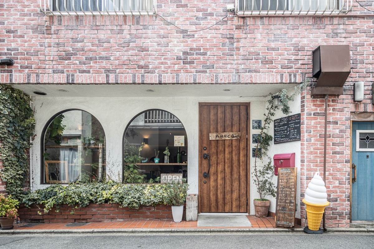 同志社大学今出川キャンパスと新町キャンパスの間に位置する「AMUCA」。オーナー夫妻が2010年に店をオープンして以来、10年以上に渡りご近所の方や学生さんたちに愛されるお店です。植物で縁取られた煉瓦壁とアーチ型の二つ並んだ窓が特徴のかわいらしい外観。