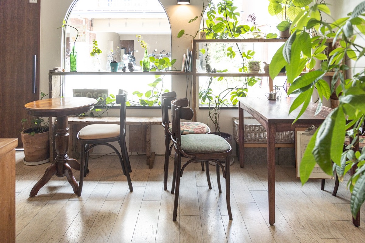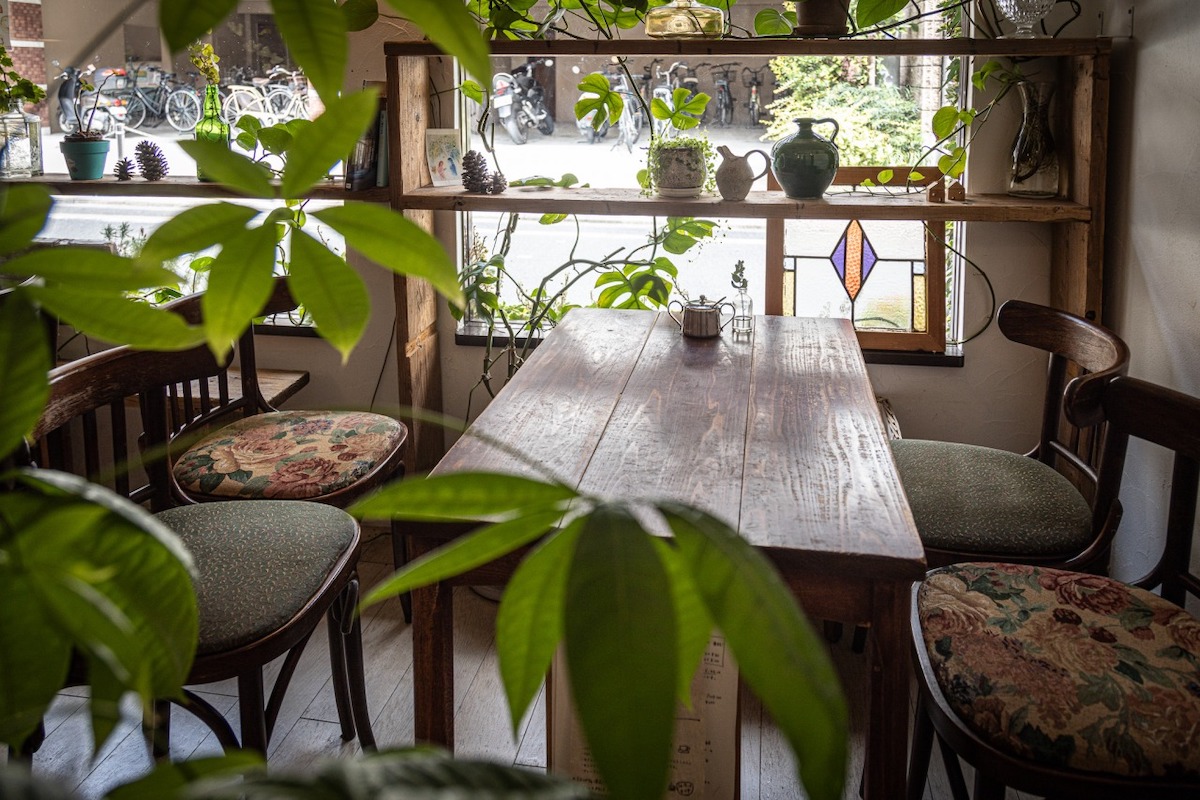 中に入ると、店内にも緑がいっぱい。アーチ型の大きな窓から入る自然光が気持ちよく、清々しい気持ちになれます。椅子もテーブルも一脚ずつ違い、アンティークや作家もの。