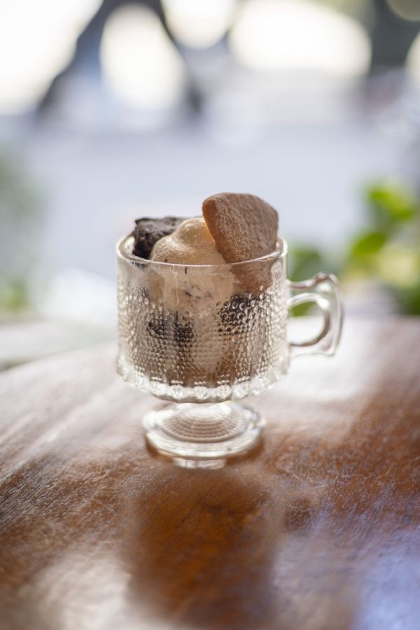 レトロなグラスに入ったミニパフェ。サイズは小さいもののチョコブラウニーや焼き菓子などが入って食べ応えがあります。