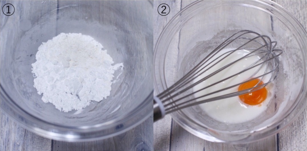 ①薄力粉とコーンスターチを耐熱のボウルに入れ、600wのレンジで1分加熱します。