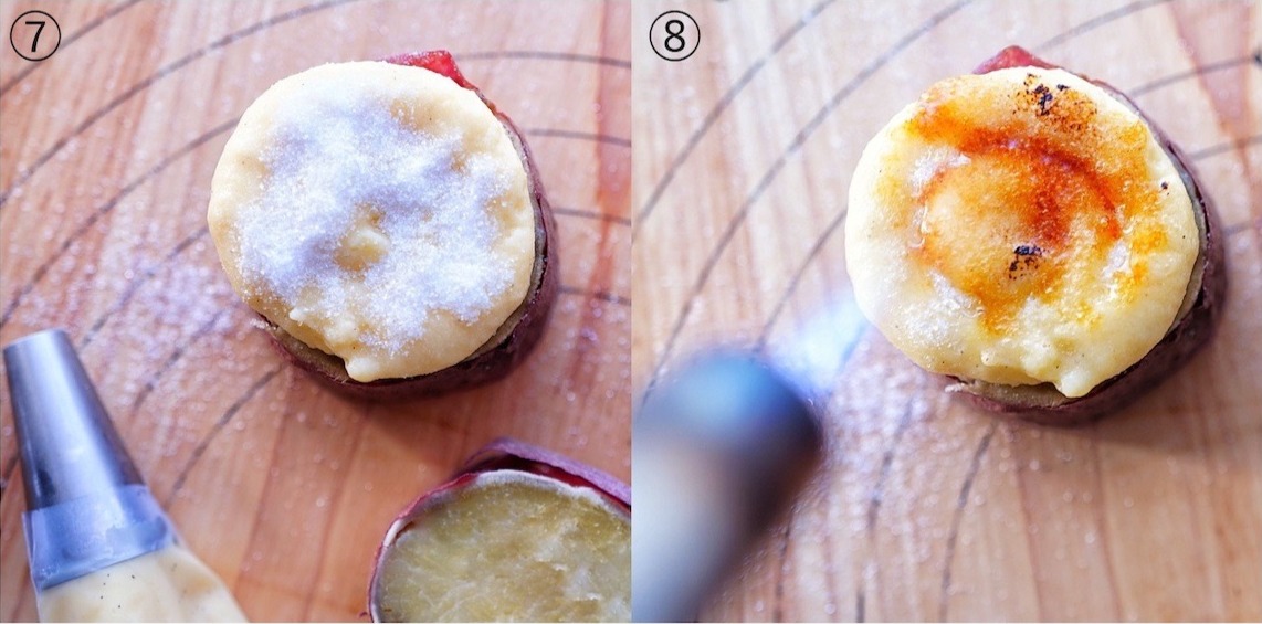 ⑧バーナーで砂糖が溶けて茶色く色づくまで炙ります。(カラメリゼ)