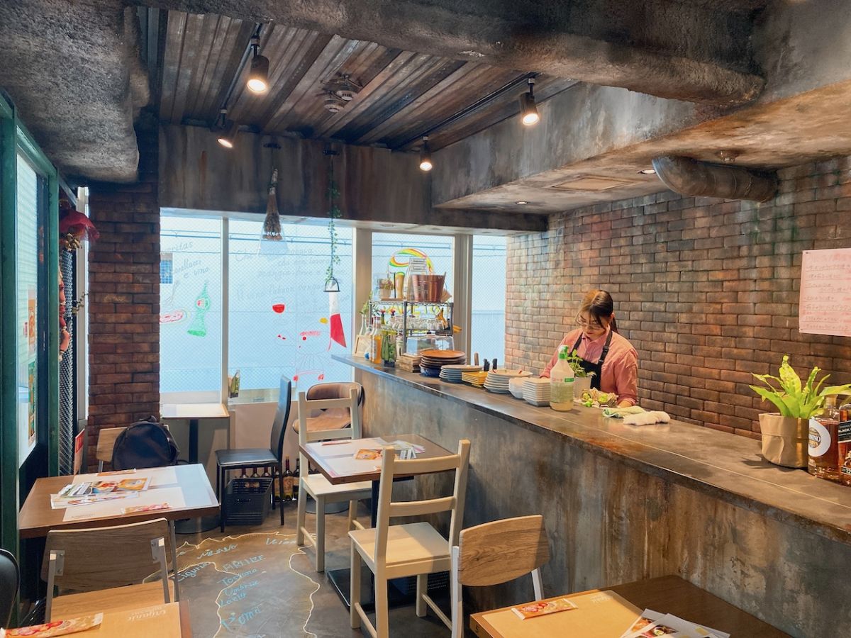 ガラス扉の向こうには、温かな照明のもとレンガ調の壁がかっこいい、おしゃれな空間が広がっています。内装は店主の友人との思い出の地であるニューヨークの街をイメージして作ったそう。