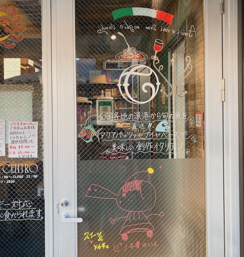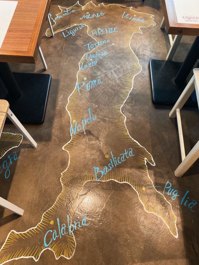 店内でなによりも目につくのは床に描かれた大きなイタリアの地図。イタリアンの料理人でもある店主が描いたものだそう。ほかにも店内の至るところに絵が描かれているので、ぜひ探してみて。
