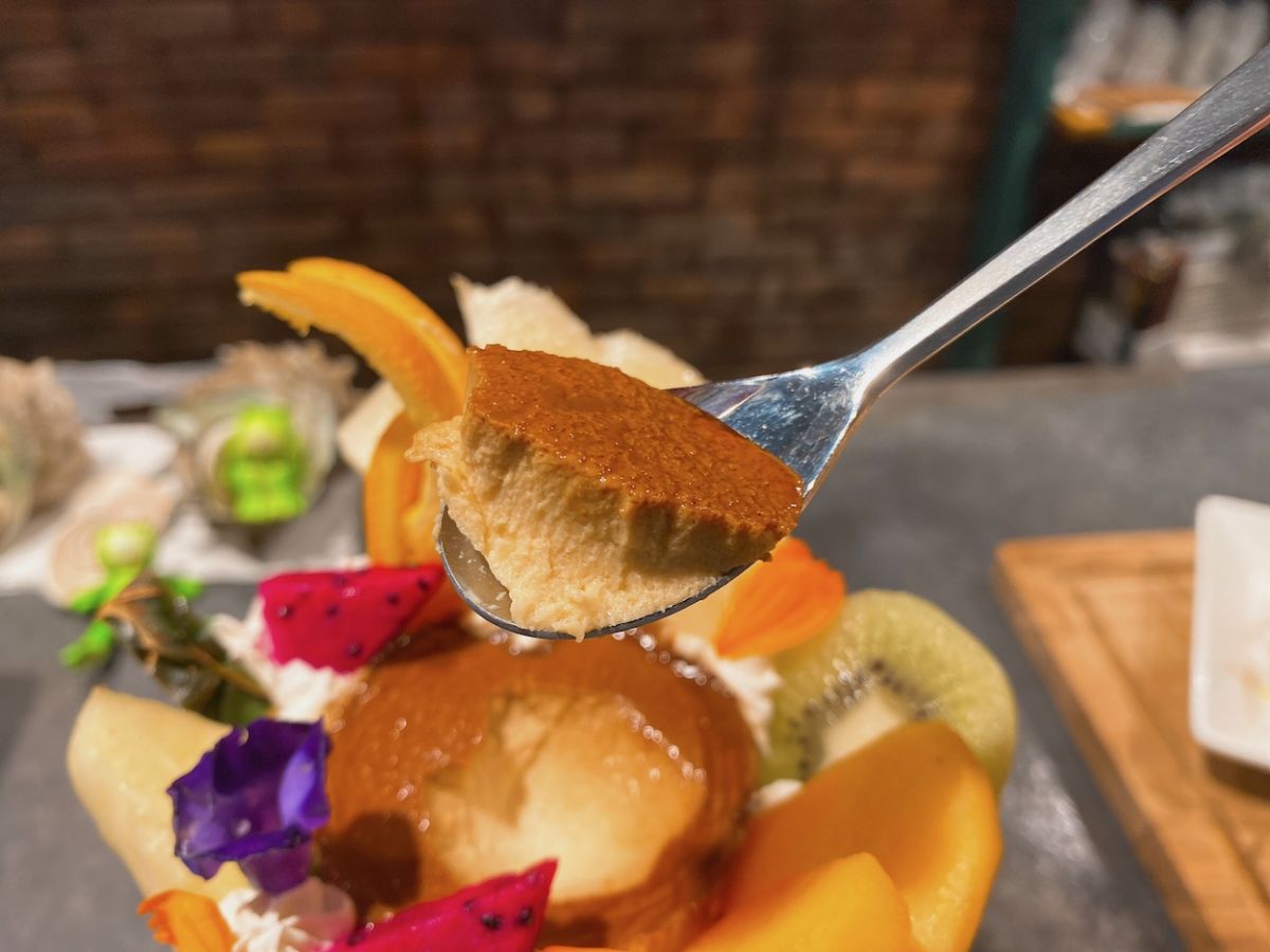 「イタリアンプリンパフェ」にはプリン、オレンジ、パイン、キウイ、バナナ、季節のフルーツ、ヨーグルトムース、スポンジ、そしてパッションフルーツゼリーが使われています。プリンはなめらかでありつつ少し固め、ビターなカラメルとプリンの甘さのバランスがちょうど良い仕上がりです。フルーツやゼリーなど、さまざまな食感を楽しむこともでき、パフェ全体での調和がとれた素敵なひと品になっています。ドリンクはルイボスティーやアイスコーヒーなどの20種類から注文可能です。