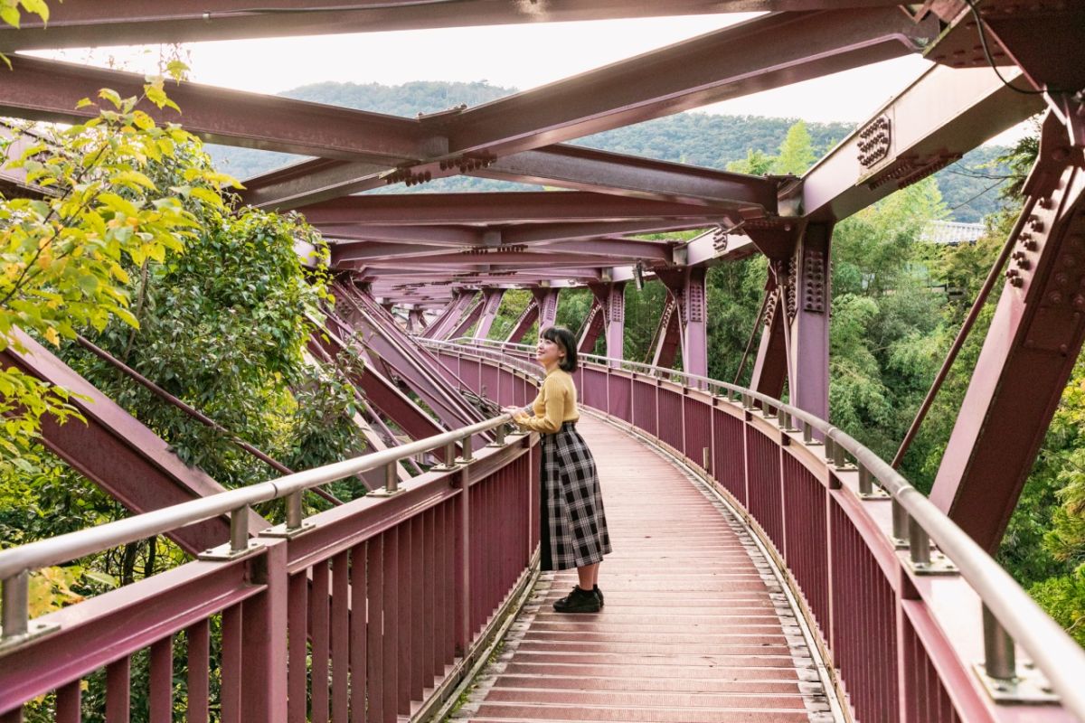 斬新なデザインの「あやとりはし」を渡って鶴仙渓・川床へ