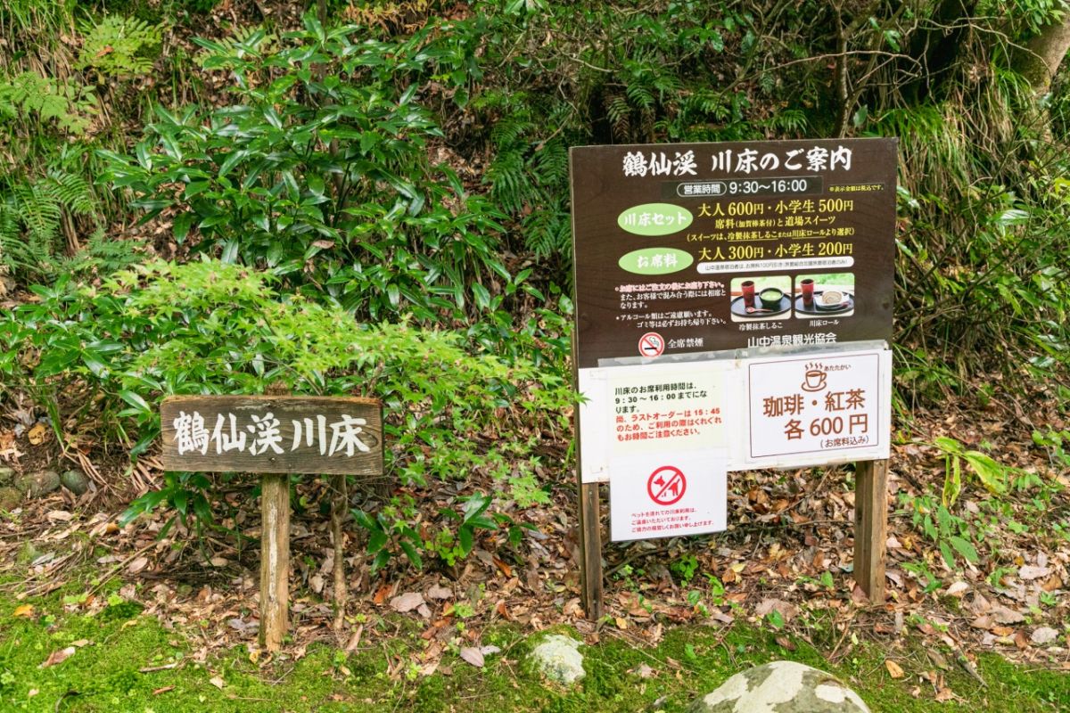 道に沿って歩いていくと、鶴仙渓・川床に到着!まずは受付で席料をお支払いします。席料は3種類で、オススメは「川床セット」。大人600円、小学生500円で、席料に加えて加賀棒茶と道場スイーツ(冷製抹茶しるこか川床ロールから選択)がついています。ほかには席料と加賀棒茶がセットになった大人300円、小学生200円のプラン、席料とあたたかい珈琲もしくは紅茶が選べる600円のプラン。また、山中温泉宿泊者は席料が100円引き(旅館組合加盟旅館宿泊者のみ)になりますよ。