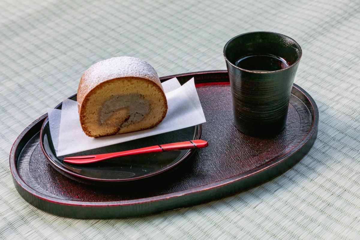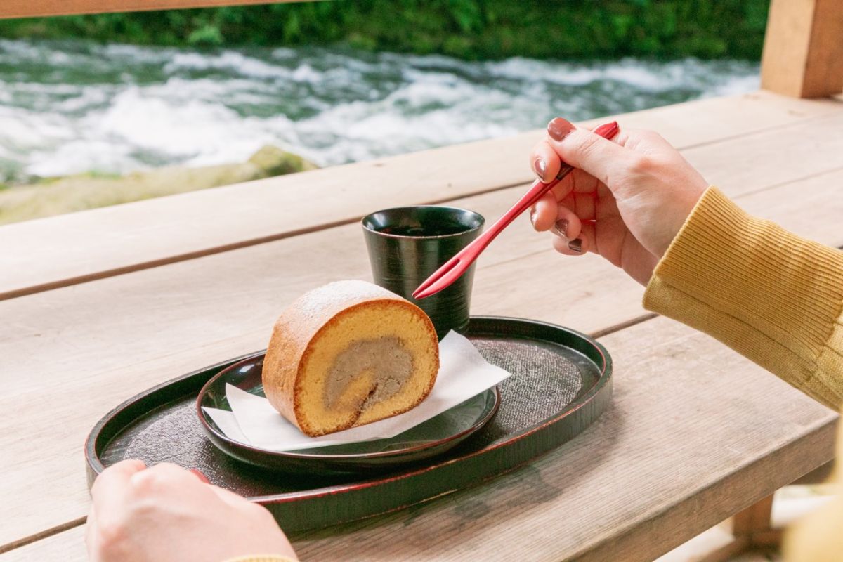 早速川床ロールを頂きます!フォークを入れてみると、ふわふわ♪ 山中温泉地域の味噌を生地に練り込んでいて、クリームには加賀棒茶を使っているというこだわりも。甘くておいしいだけではなく、セットについてくる加賀棒茶と川床ロールが合う理由が分かります。