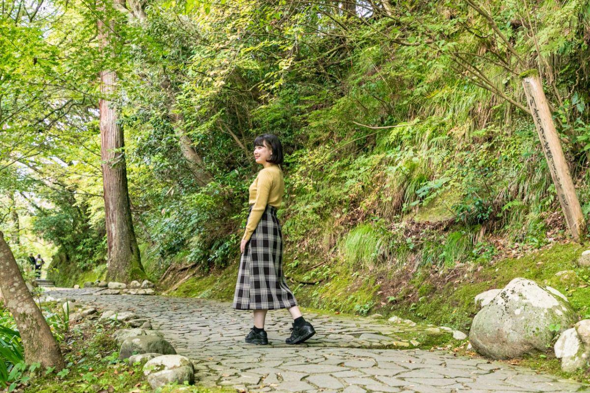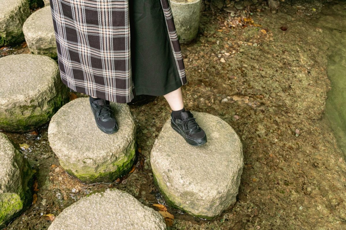 ちなみに、不動滝の前ではこのような石を渡ったりするので歩きやすい靴の方が良いかもしれません。遊歩道を歩いて森林浴をしたい場合なども歩きやすい靴が良さそうですね。