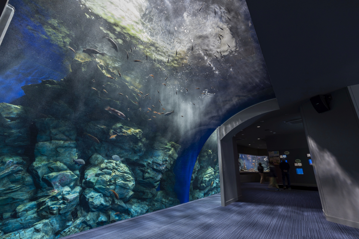 「九州の近海」エリアは足元から頭上まで水槽になっていて、まるで海の中に入り込んだような感覚に!「玄界灘水槽」では、荒波が打ちつける玄界灘が再現され、押し寄せる波に揉まれながら泳ぐ魚を眺めることができます。