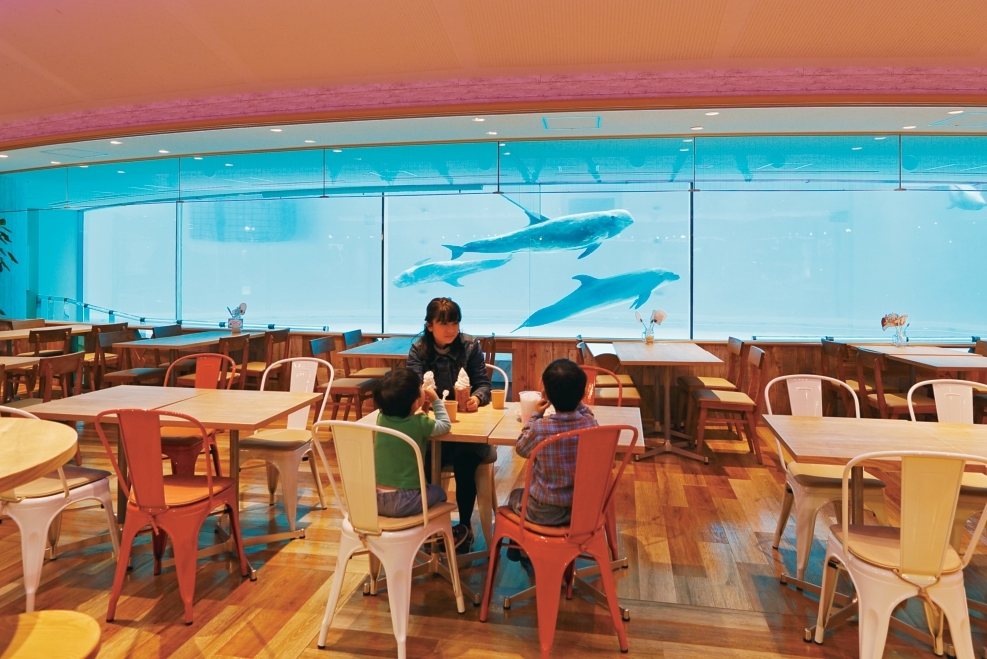 1階にあるレストラン「restaurant Reilly」では、イルカが泳ぎながらジャンプするショープールの水中の様子を眺めながら、食事を楽しむことも!
