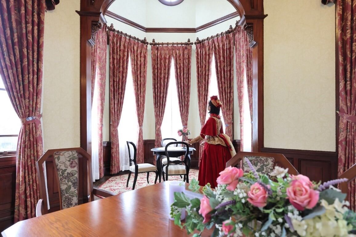 館内をゆっくり見学した後は、カフェタイムでひと息。見学部屋の「1階食堂」はカフェとしても使用されていて、貴賓館に入館した人だけが利用可能です。スイーツやコーヒー、紅茶などを味わいながら、明治時代に思いを馳せてみてはいかが?