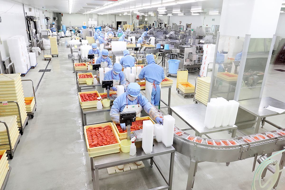 2階では、明太子の基礎知識を学ぶとともに、その製造過程が見学できます。タラコはきわめて繊細なため、現代においても職人の手作業に頼る部分が多いのだそう。
