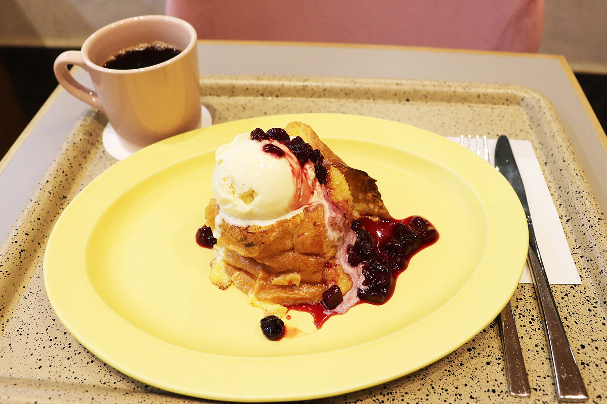 有料の食事やデザートは、喫茶らしいメニューが充実。「厚切りフレンチトースト ベリーソースとバニラアイス添え」は、しっかりと味が染み込んだフレンチトーストが、バニラアイスやベリーソースの酸味と絶妙にマッチ。