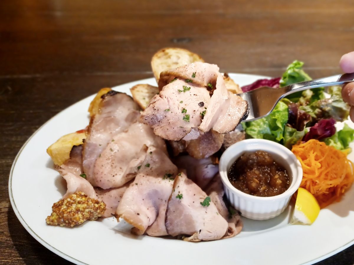 ローストポークを一口食べると、そのやわらかさに驚き!味つけは塩とブラックペッパーのみとシンプルで、噛むほどに肉のうま味が感じられます。