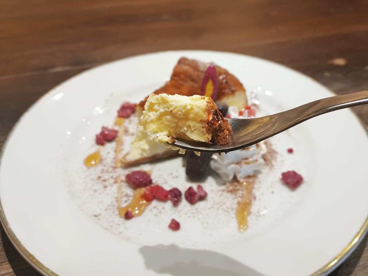 「ベイクドチーズケーキ」は、クリームやソースが添えられた華やかな一皿。