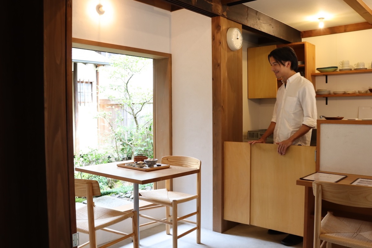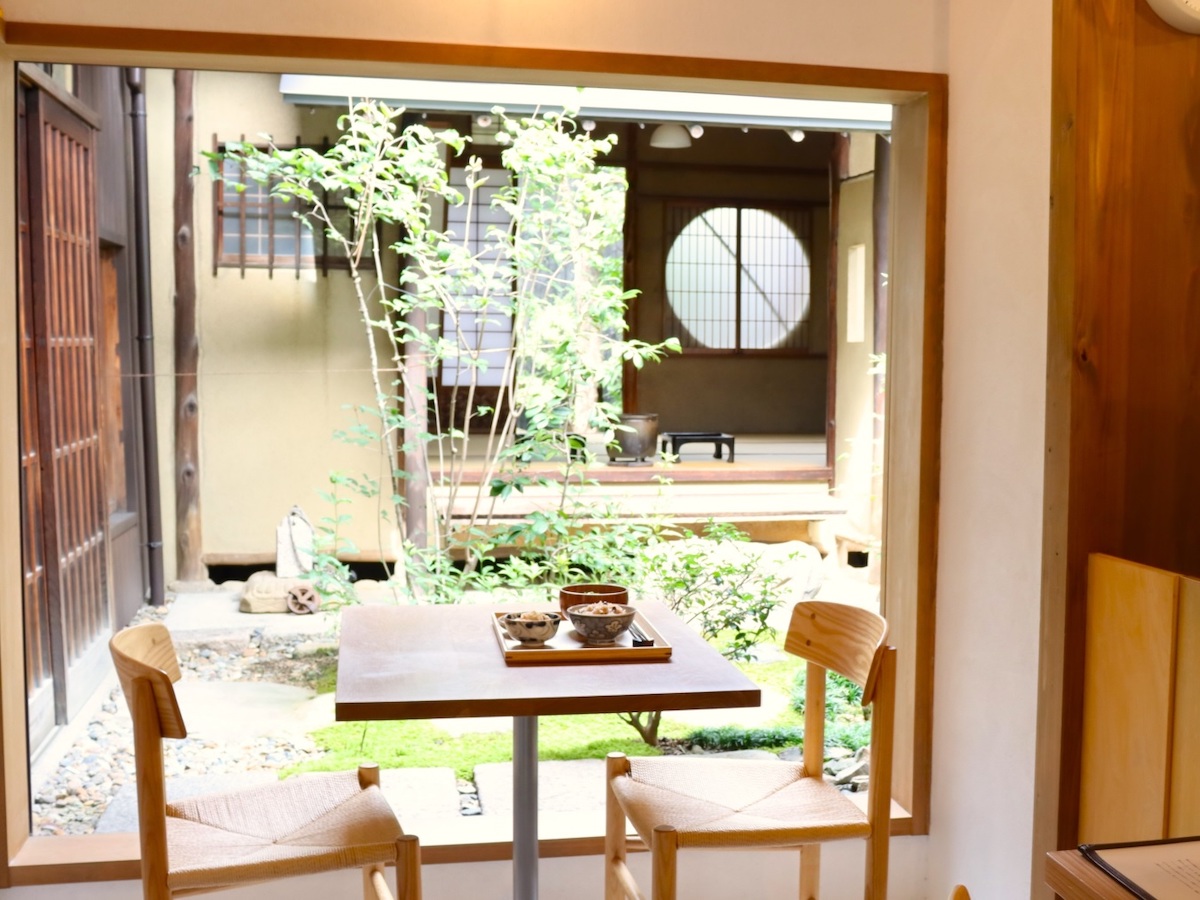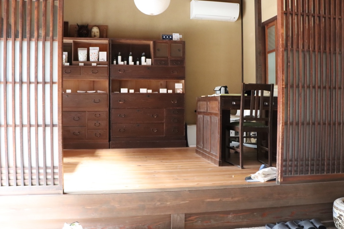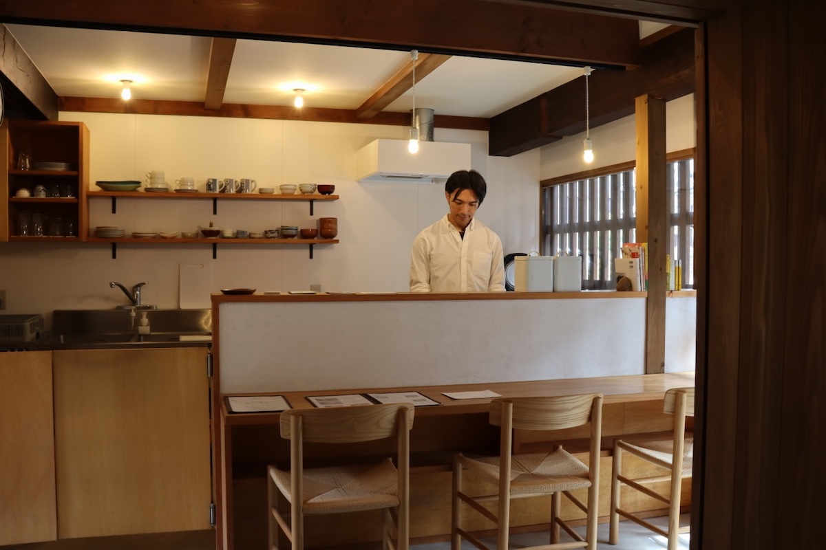 通り土間を挟んだショップの反対側には、土間をリノベーションしたカフェ。古い梁や重厚な壁はそのままに、ゆったりと5人のお客様をおもてなしする明るい空間です。