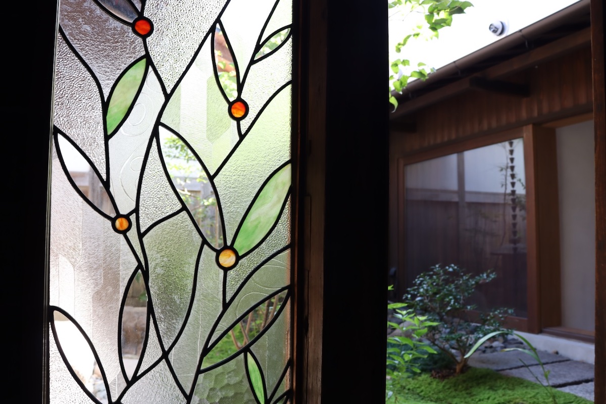 坪庭へは通り土間の戸口から出入りします。戸口の横にしつらえた窓には、今では手に入らない複数の飾りガラスを使ったステンドグラスがはめられていて素敵。これは改修の際に外した古いガラスを再利用して、作家さんが作ったものだそう。