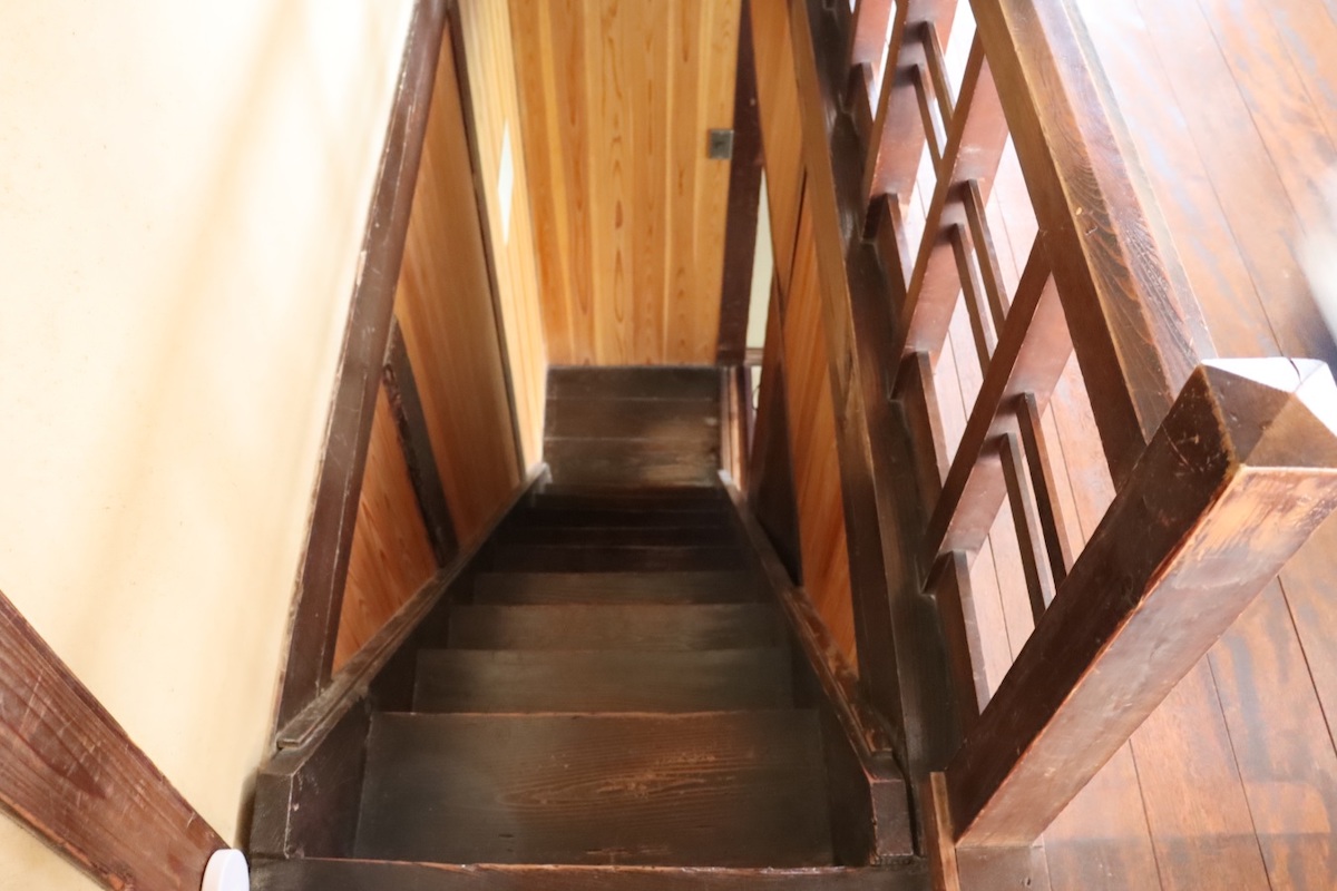 階段は建てられた当時のまま。落下防止の柵の色褪せ具合も味わい深く、ツルンとした感触が手になじみます。