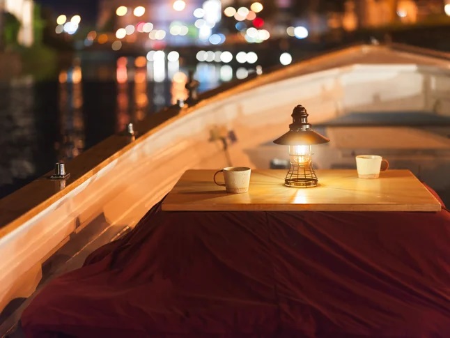 今シーズンは2024年12⽉14⽇(土)〜2024年3⽉31⽇(月)の⼟・⽇曜限定で開催が決定! 約40分間の運河クルーズを温かいこたつ付きの船で楽しめます。
