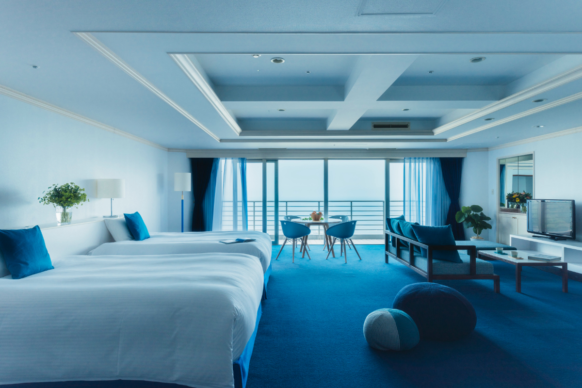 相模湾を見渡す高台に立ち、全室オーシャンビューのリゾートホテル。青と白を基調にしたスタイリッシュな客室からはもちろん、大浴場からも熱海の花火大会も見ることができます。海やイチゴなど地域の特産品や魅力を生かした季節ごとのイベントも開催。最上階には白砂を敷き詰めたカフェが、そのほかにもツリーハウスや樹上アスレチックで思いっきり遊べる「森の空中基地 くすくす」などがあり、1泊では遊び尽くせないほど楽しみが詰まったホテルです。