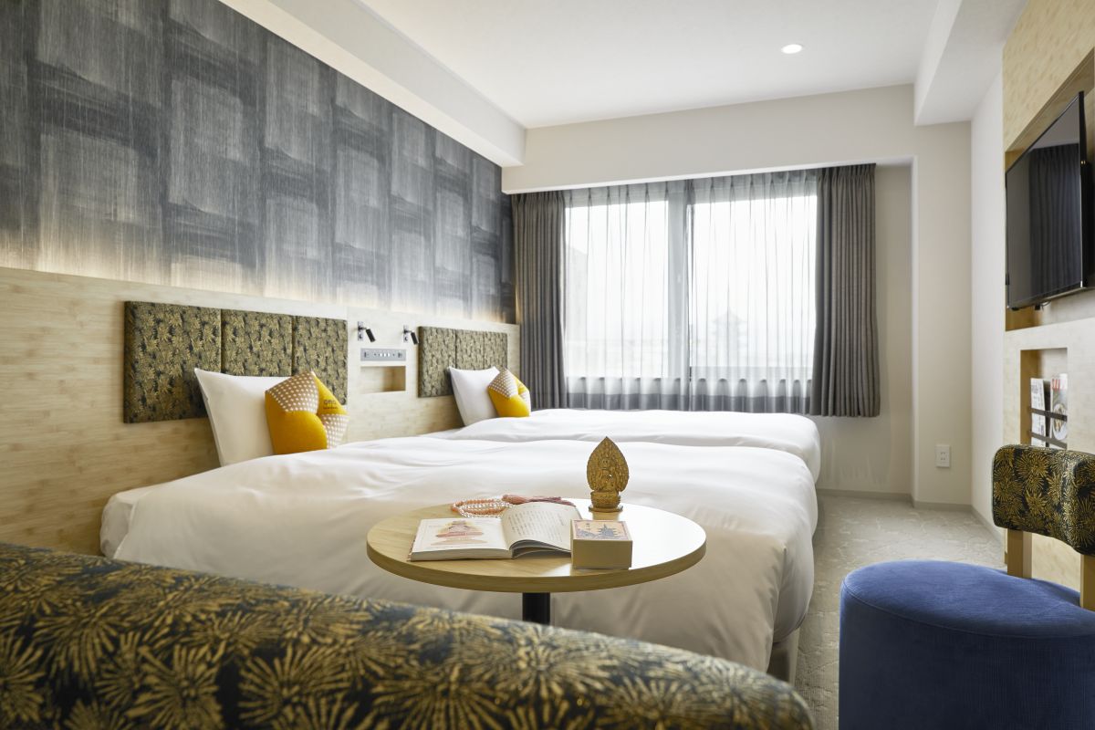 熊本の一等地「下通・上通商店街」の中心に立ち、館内には街や熊本城を眺望できる開放的なテラスも。熊本の豊かな山や滝などから着想を得たという壁面の色合いに安らぎを感じる客室は、秘密基地のような「やぐらルーム」からグループ旅行や家族旅行に快適な「OMOハウス」、2つのベッドの間に円卓をイメージしたテーブルがある「えんたくルーム」(写真)など8タイプ。あか牛など熊本名物を使ったユニークなメニューが味わえるカフェもおすすめです。
