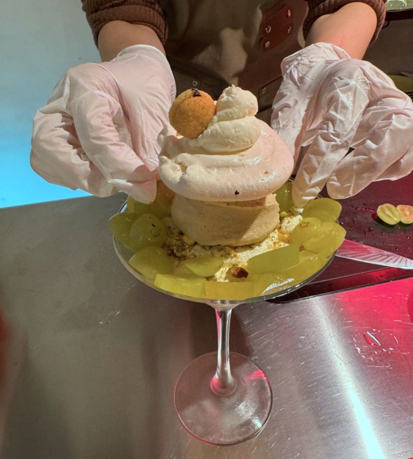 梨のジュレにたっぷりのシャインマスカットや生クリーム、ピスタチオのジェラート、バーチ・ディ・ダーマ(イタリア発祥のチョコレートをはさんだクッキー)、メレンゲなどを重ね、チョコレートをトッピングしています。