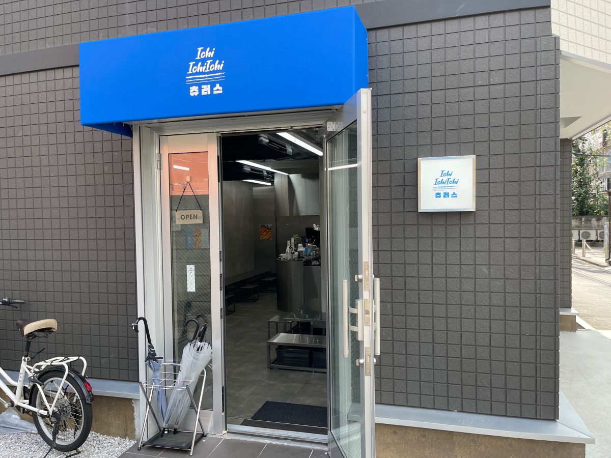 東京メトロ東新宿駅から徒歩約5分、JR新大久保駅から徒歩約8分の場所に位置する「111 CHURROS」。キーカラーのブルーと白の組み合わせが目を引く外観が目印です。