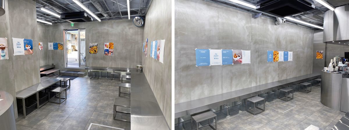 店内はコンクリートとステンレスのグレーがスタイリッシュな無機質空間です。