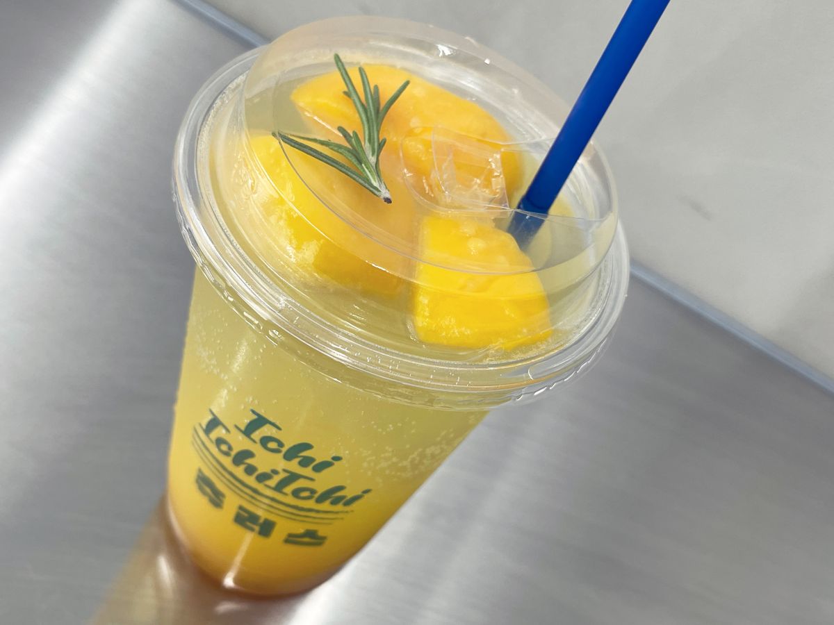 エード系で一番人気なのが「マンゴーオレンジエード」。大きめにカットされたマンゴーがゴロゴロ入った、飲みごたえ&食べごたえ抜群のドリンクです。濃厚で甘めですが、炭酸でさっぱりと飲める上、チュロスとの相性もばっちり。