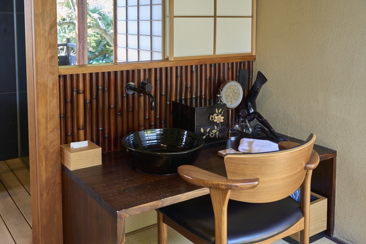 本館スイートとこちらの「104 メゾネット茶室付」、新館のジュニアスイートのみ、ドライヤーはレプロナイザーです。和の雰囲気が素敵な洗面台ですが、話題の高級ドライヤーが置いてあるのはさすが!旅先で試せるなんてうれしいですよね。