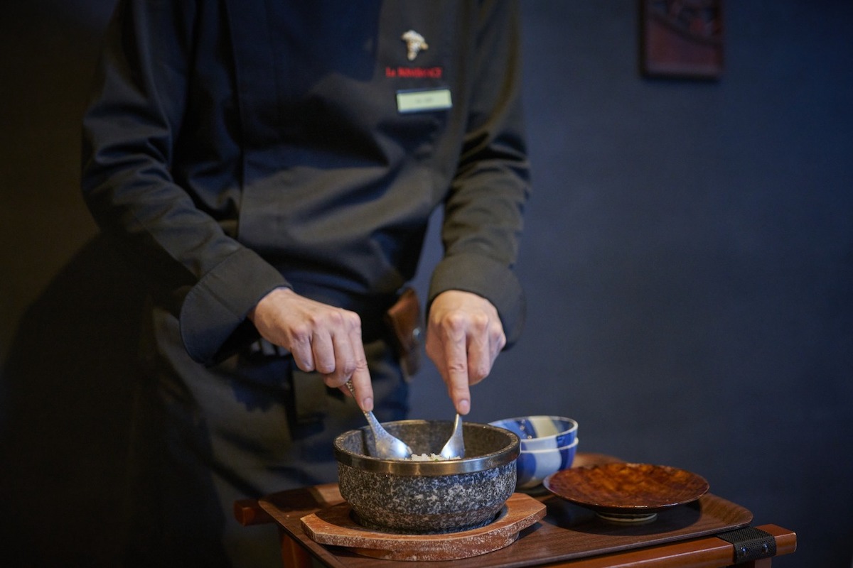 「一汁三菜」には炊き込みご飯が付き、テーブルのそばで盛り付けてくれます。取材時は栗とちりめんじゃこの炊き込みご飯でしたが、季節によって旬の食材が楽しめます。予約がおすすめですが、当日運よく席が空いていれば予約なしでも案内してもらえます。
