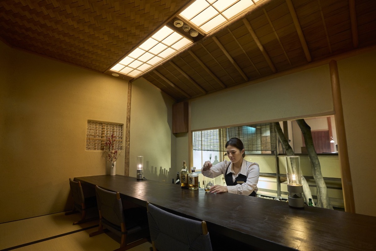 館内にはカウンターを備えた畳敷きのバーがあります。京都の名匠が手がけた座敷を生かしつつリノベーションされた、4席のみのプライベート感あふれる空間です。昼間は読書室などとして自由に利用できます。現時点ではバーの利用は宿泊者限定で、予約は不要です。