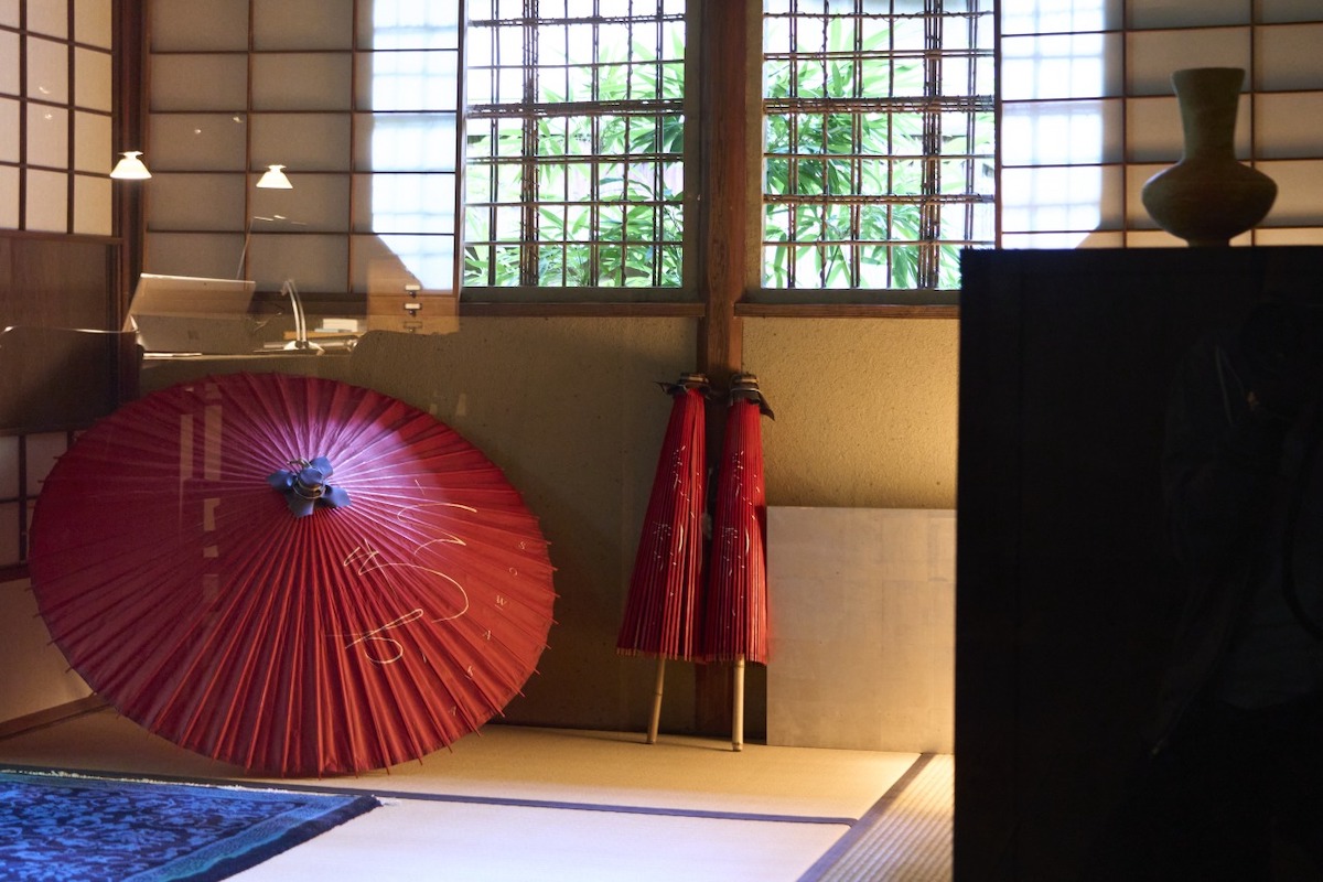 ウェルカムドリンクは時期によって内容が変わる場合がありますが、通常、冷たいお茶や温かいお茶がいただけます。写真の左側に映るのは、京都に関する本や、数寄屋建築に関する本などを集めたライブラリー。滞在中、自由に利用することができます。