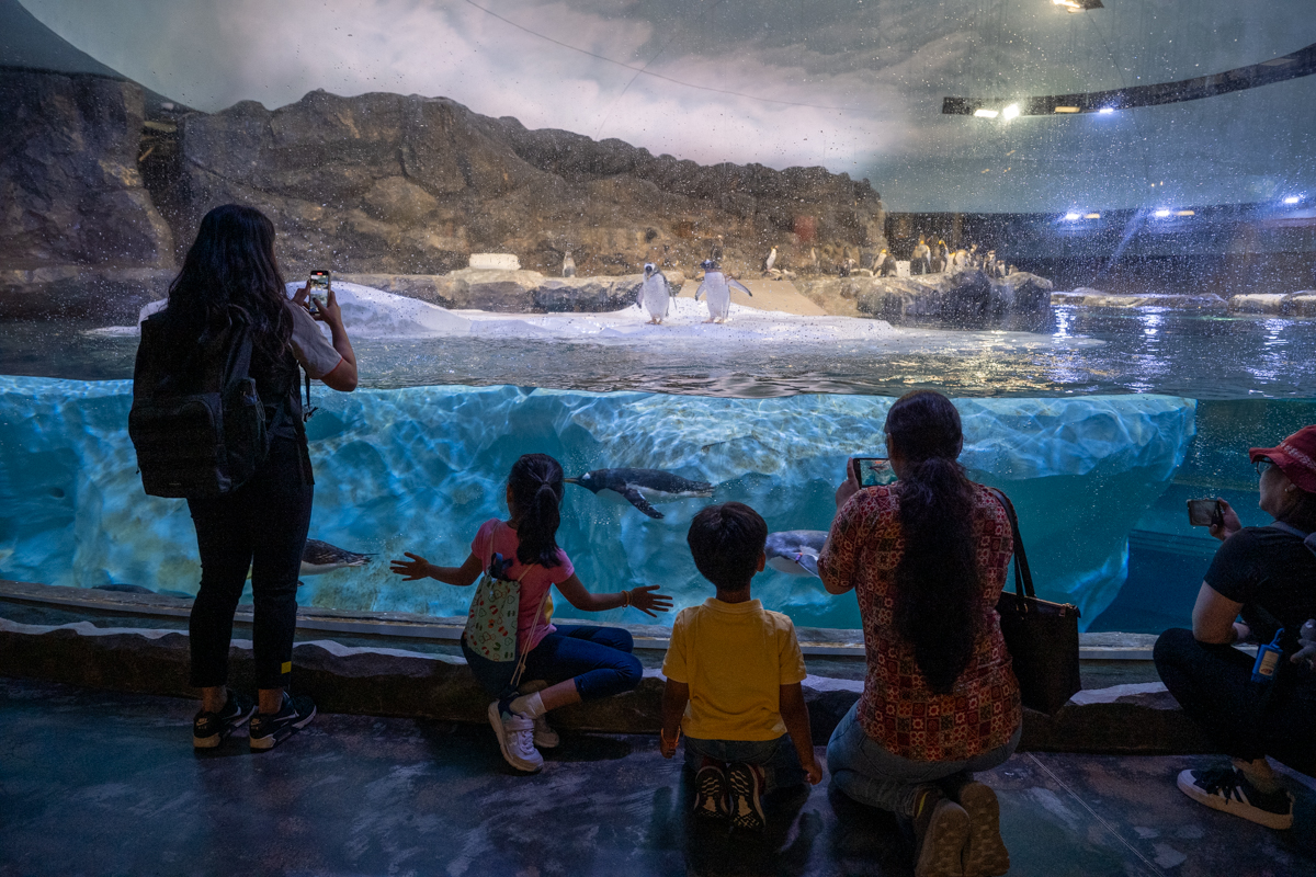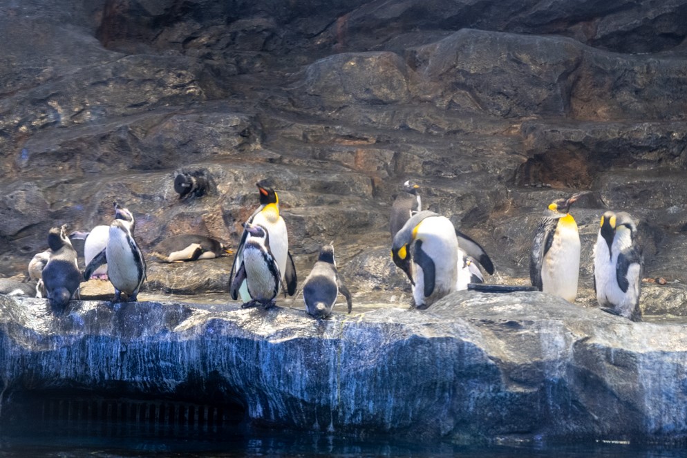 「オーシャンネットワークエクスプレス ペンギンコーブ(Ocean Network Express Penguin Cove)」は、3000㎡という巨大水槽の中で、4種類のペンギンたちが暮らす姿を見ることができる、屋内の展示施設です。展示内の照明はペンギンの繁殖サイクルに合うように、亜南極の島々の太陽光を再現しているのだとか!