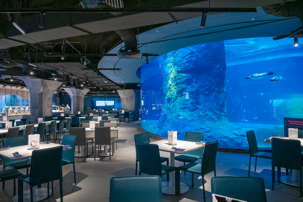 大きな水槽を目の前に、まるで自分も水の中にいるような気分になれるレストラン。「オーシャンネットワークエクスプレス ペンギンコーブ」の1階にあります。どこに座ってもペンギンがダイナミックに泳ぐ姿が見られますが、やっぱり水槽近くの席がおすすめ!