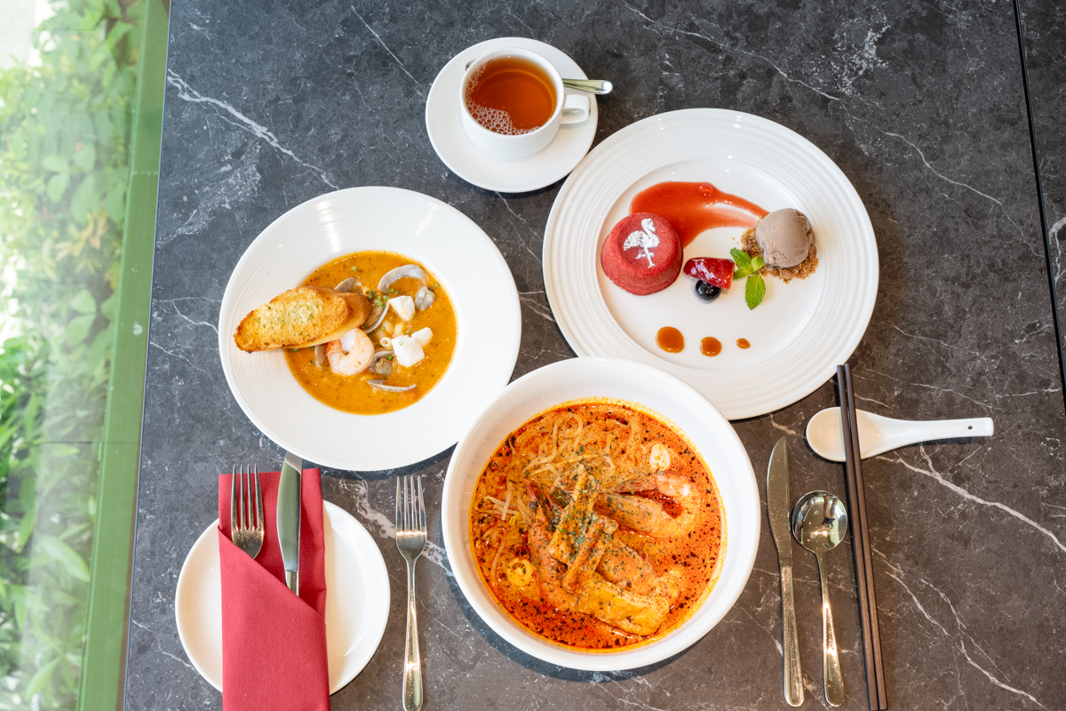 コース内容は、前菜とメイン、飲み物(コーヒーか紅茶)。3品コースにはさらにデザートが付きます。キングプラウンのラクサ(写真手前)はお店のシグネチャーメニューです。デザート(写真右)にあしらわれたフラミンゴのアートがかわいい!
