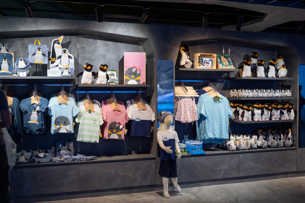 前述のカフェに併設されたショップ。ぬいぐるみやおもちゃ、雑貨など、かわいらしいペンギングッズが多数揃っています。Tシャツをはじめ、キッズ用のアパレルも充実しているので、着替えを現地調達するのも便利です。