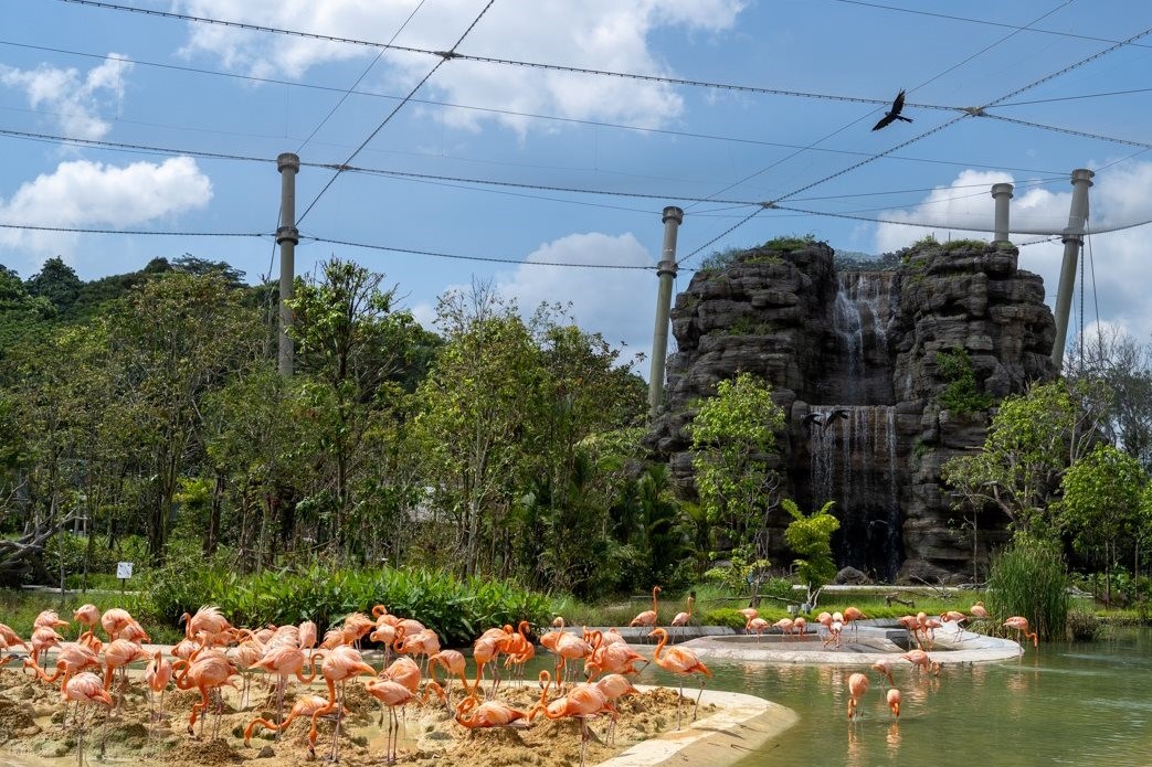 「ホンリョン・ファウンデーション・クリムゾン湿地帯(Hong Leong Foundation Crimson Wetland)」はコロンビアのサン・ファン・クリの滝からインスピレーションを得た高さ20mの滝をバックに、湿地帯が広がるエリア。フラミンゴやショウジョウトキなど、赤やピンクの鳥たちが集う姿は圧巻です!
