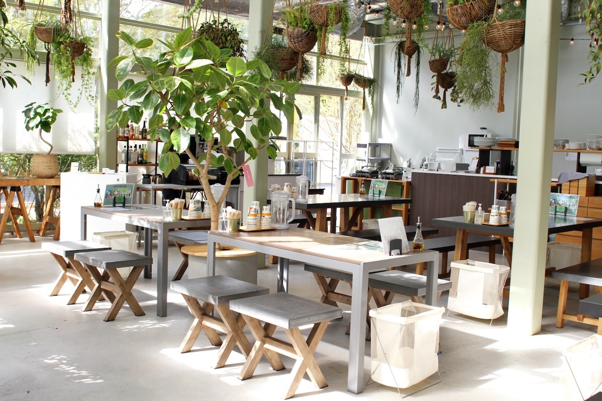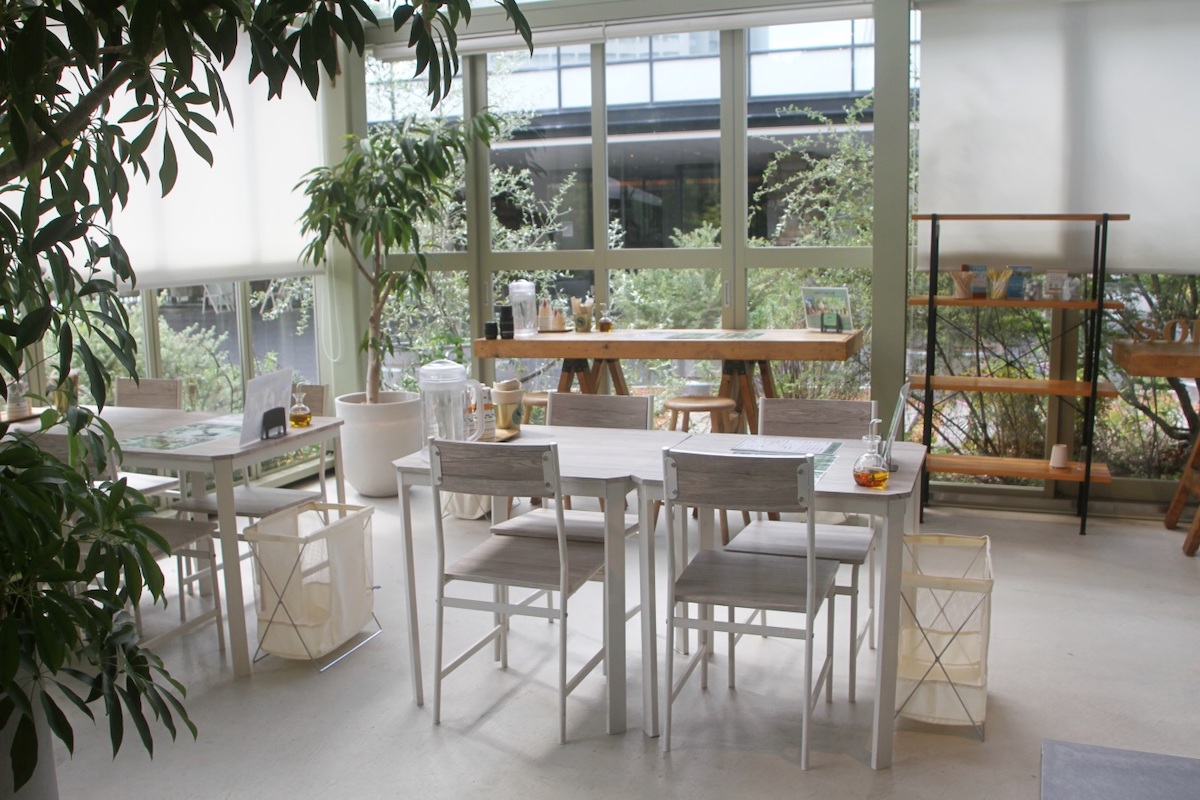 お店のテーマ「植物とともにある豊かな時間を通じて、実りある人生を」にあるように、店内には植物があちこちに飾られていて、屋内にもかかわらず緑が豊か。天井も高く、開放感いっぱいの空間で食事やお茶を楽しめます。
