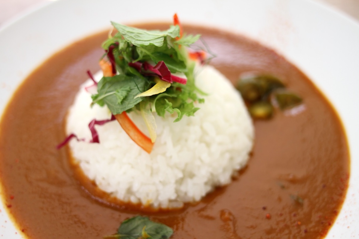 ランチタイムに人気なのが「フレンチカレー」1210円。オマール海老で出汁をとったスープに、淡路産のたまねぎ、数十種類のスパイスを加えて数日かけて作っています。マイルドな味わいの中に、オマール海老の香りとたまねぎの甘みがふわっと感じられる一品。