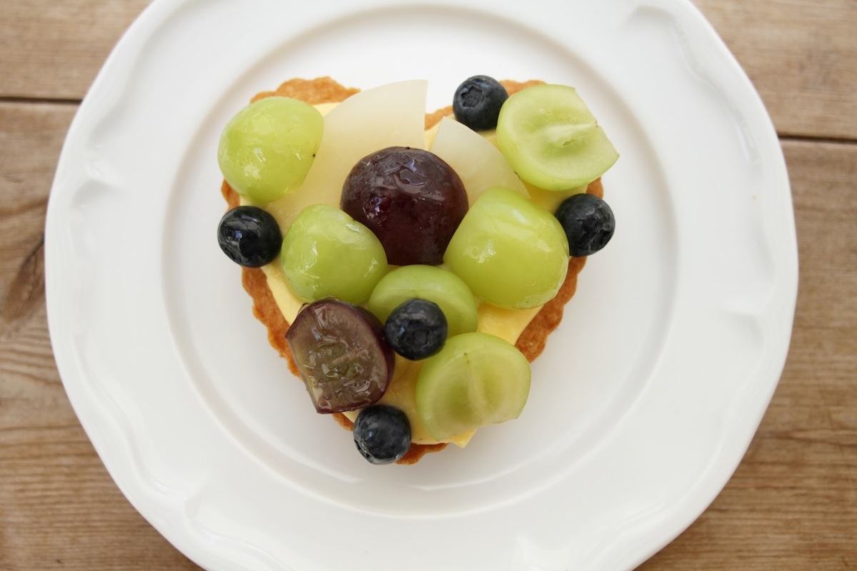 一番人気は「気まぐれフルーツタルト」660円。旬のフルーツがたっぷりトッピングされていて、見た目も華やか。一番下のパートシュクレがハートの形で、とてもかわいいです。時期によって使用するフルーツが変わるので、どんなタルトに出会えるかは来店時のお楽しみ!